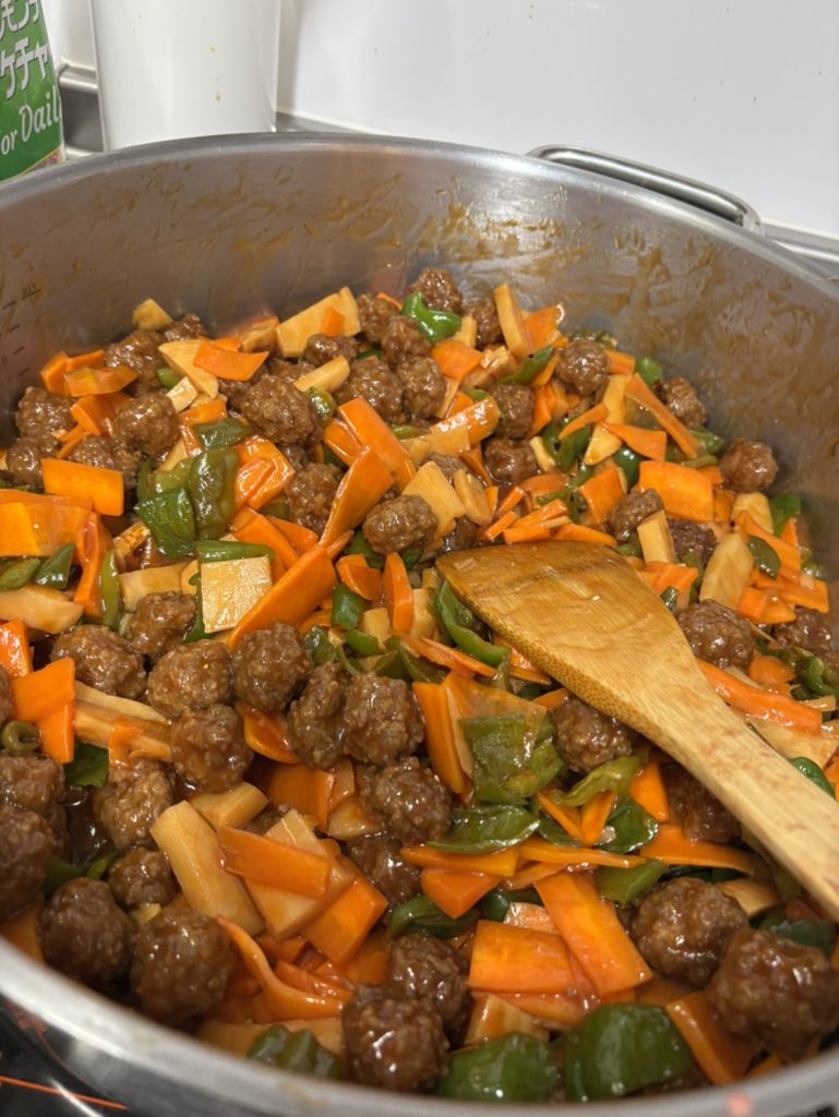 メインの肉団子は、酢豚風の甘酸っぱい味付けに仕上げ、ニンジン・ピーマン・タケノコなどの野菜をたっぷり使用しました🥬😋