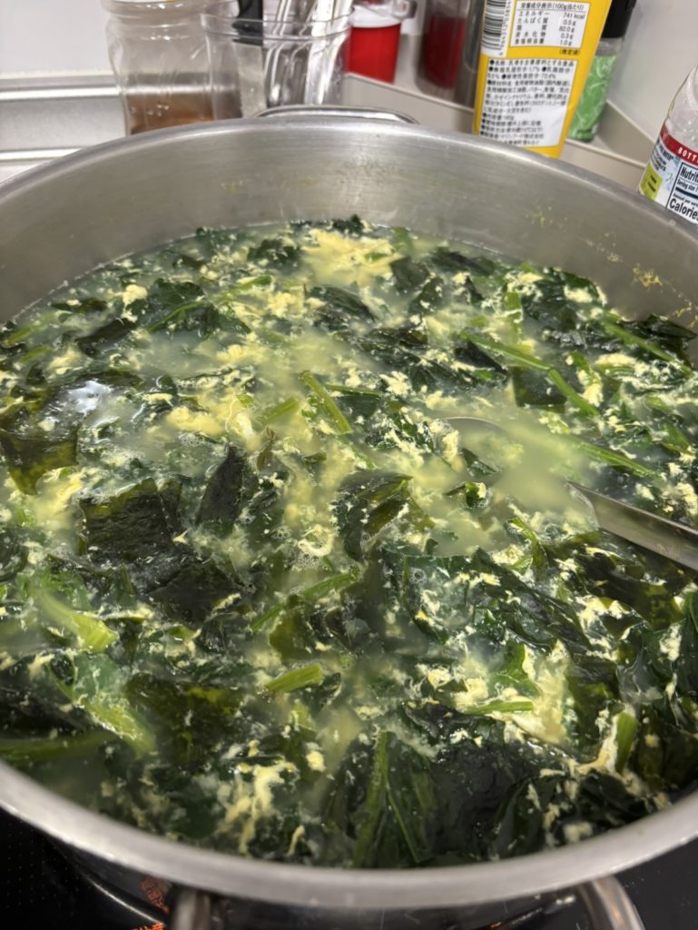 中華スープは、卵のやさしい味わいにほうれん草とわかめを合わせ、温かく体にしみる一品。