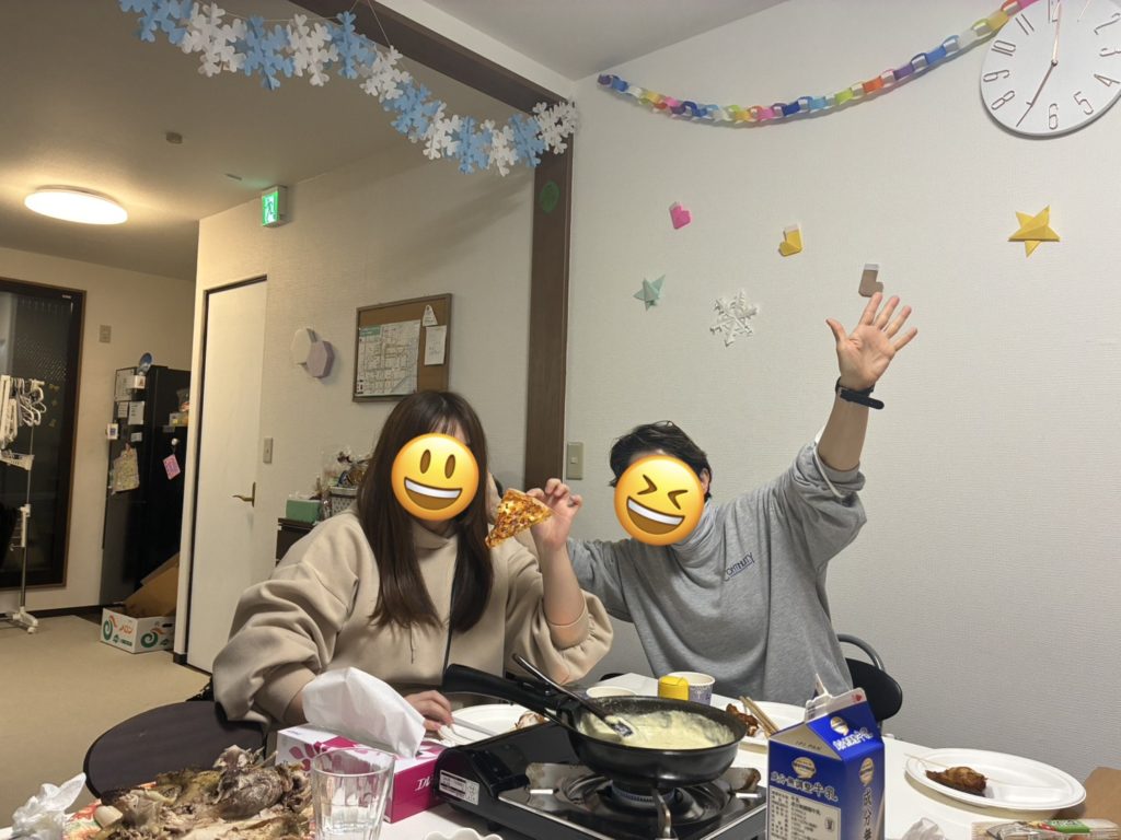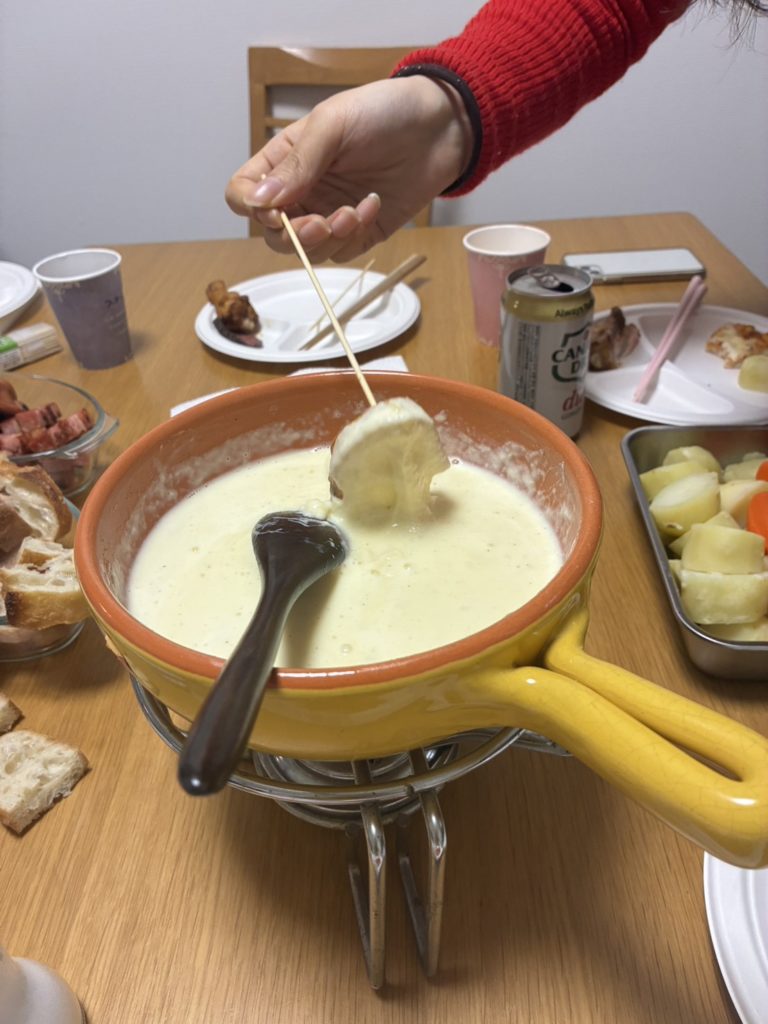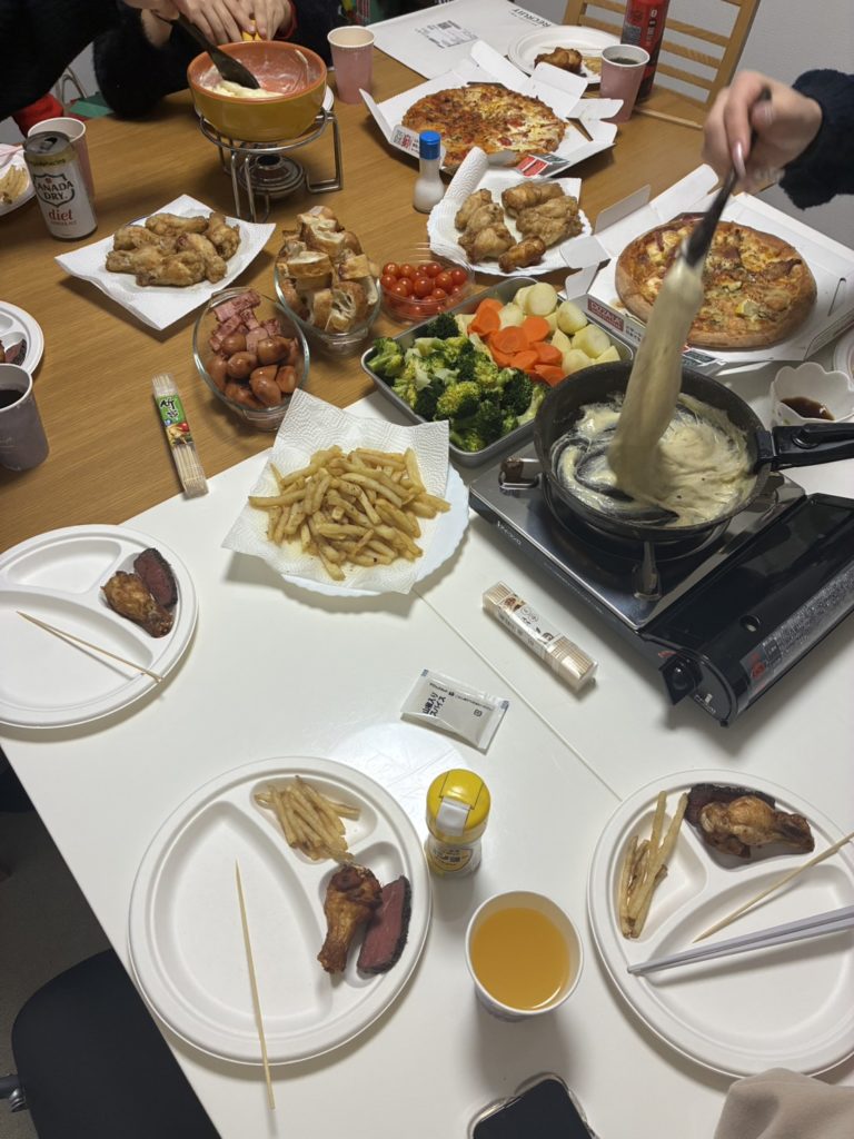 たくさんのご支援をいただき、七面鳥やピザ、チーズフォンデュなどどれもこれも美味しくて、楽しい時間でした。クリスマスプレゼントは、予算500円までというルールで、それぞれが買いに行き、交換しあってました。