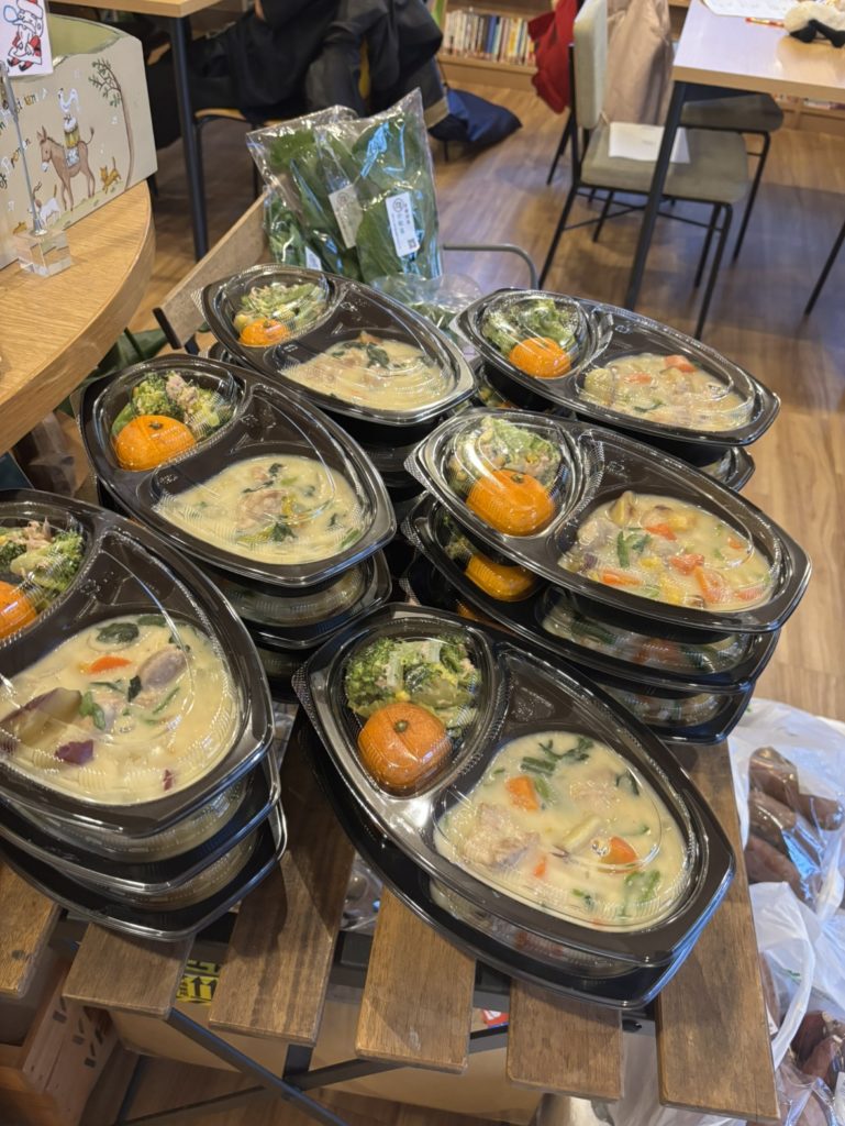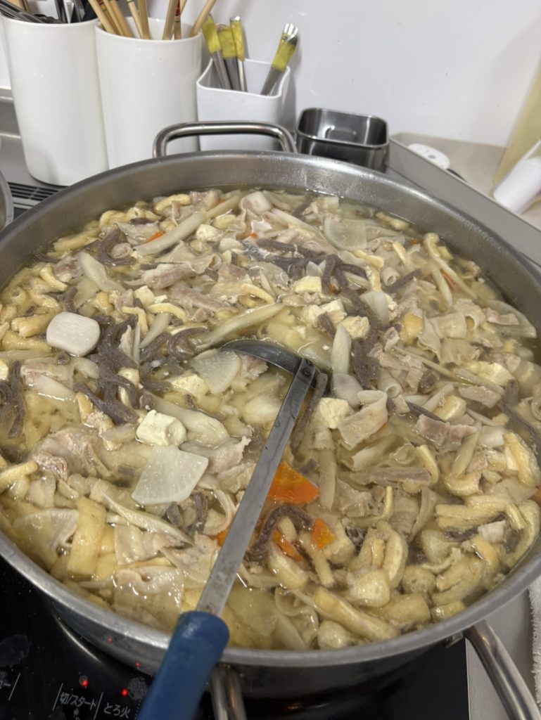 そのままでも十分ボリュームのあるお弁当でしたが、寒い日だったこともあり、スタッフで豚汁をプラスして用意しました!!