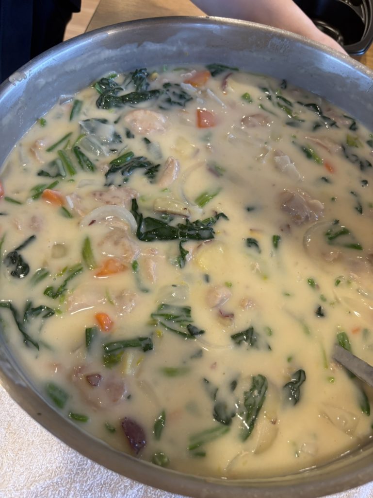 クリームシチューには、寄付でいただいたさつまいも🍠とほうれん草🥬を入れ、