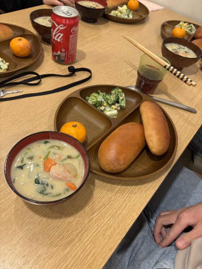 クリームシチュー、ブロッコリーのサラダ、みかん、そしてDoppoさんのケーキと、盛りだくさんの内容でした!