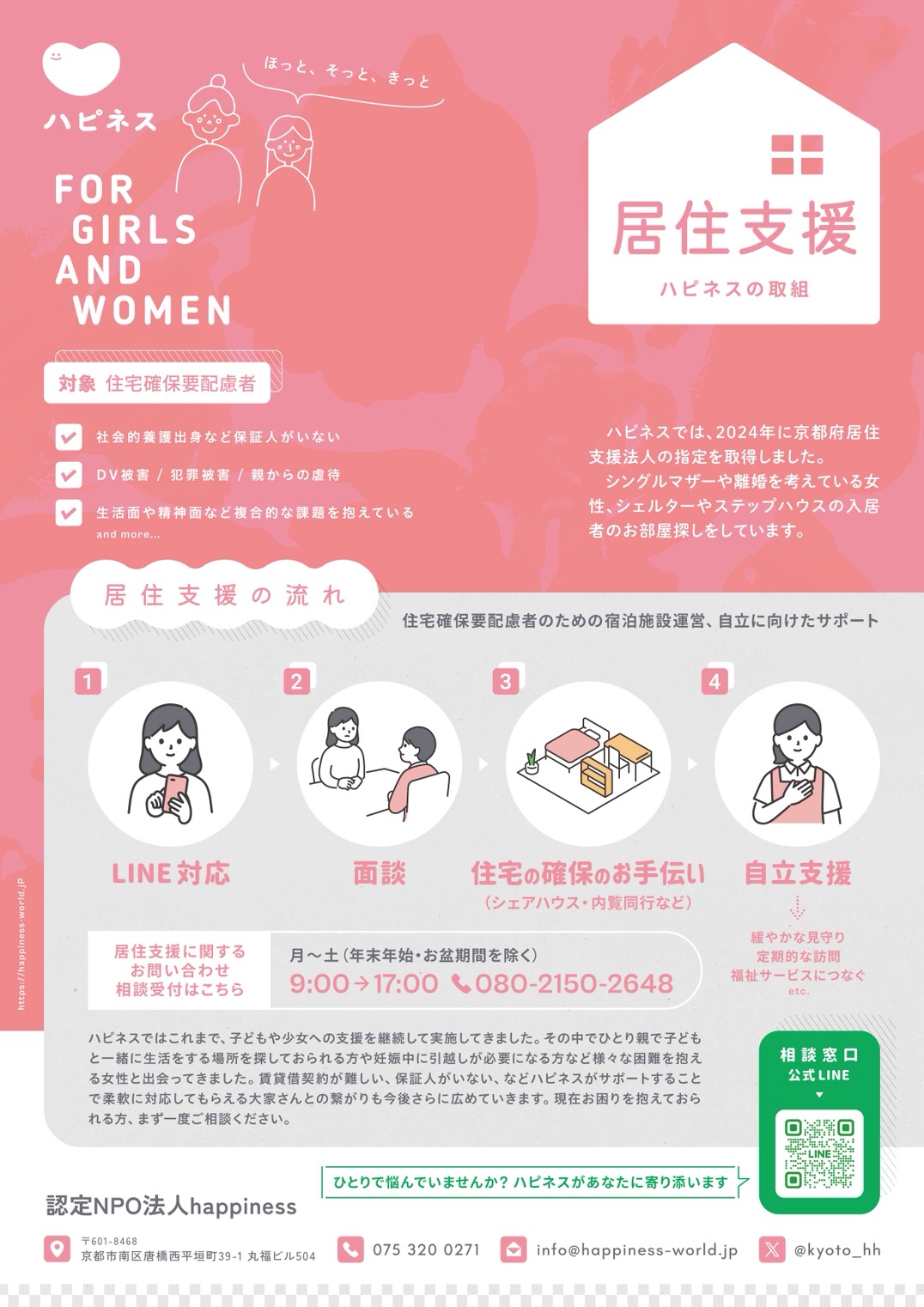 特定非営利活動法人happinessは、京都府より居住支援法人として指定を受け、住宅確保要配慮者の方々に対する住まいに関する相談支援を行っております。